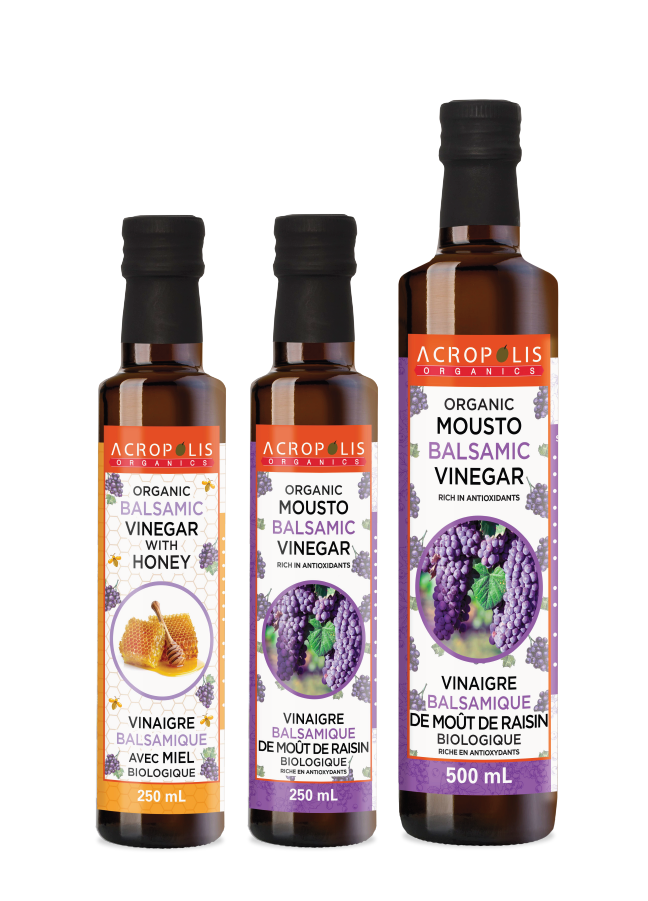 Say hello to our secret family recipe. Our Mousto Balsamic Vinegar is naturally sweetened with Petimezi – Greek pronunciation: peh-tee-MEH-zee– a traditional recipe for grape molasses. Free of corn syrup and thickeners, this is the real-big-deal balsamic vinegar for serious food lovers.
